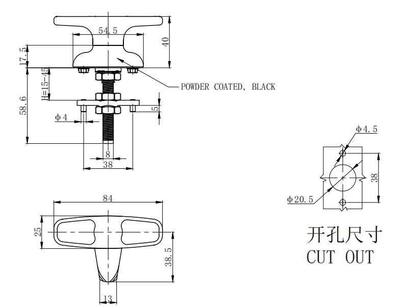 Cam latch t-handle, clockwise rotation latch/lock, short cam, zinc die, powder coated, black,B-1510-2