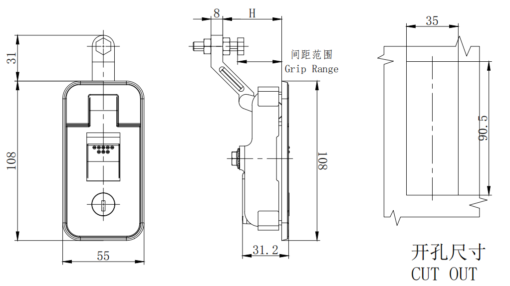 Compression door lock, sealing rod, key lock, lock belt dust cover, zinc alloy, chrome plated, bright A-1446-11-20