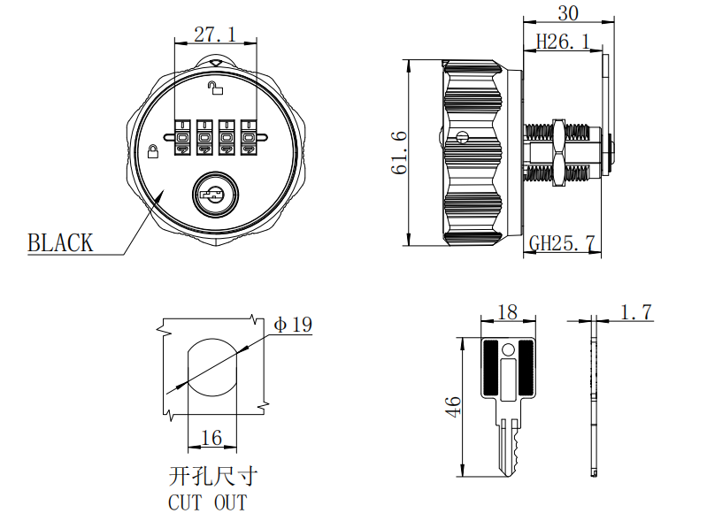 1.Material and surface treatment: Panel, knob, wheel: plastic Lock cylinder:Zinc alloy 2. Performance parameters: Protection class: IP40