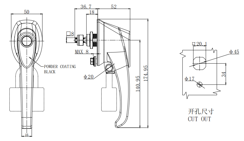 Quarter CAM bolt, L-handle with padlock, no locking, with CAM, zinc alloy, powder coating, black,B-1520-2-10