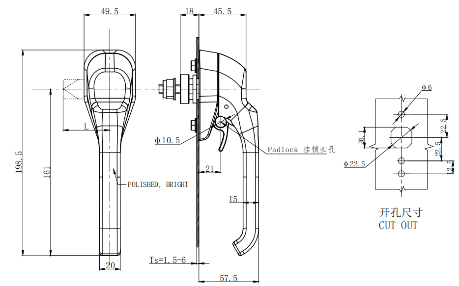Quarter CAM lock, L-handle, unlimited, no CAM, sealed, stainless steel, polished, bright,B-1524-2-A1