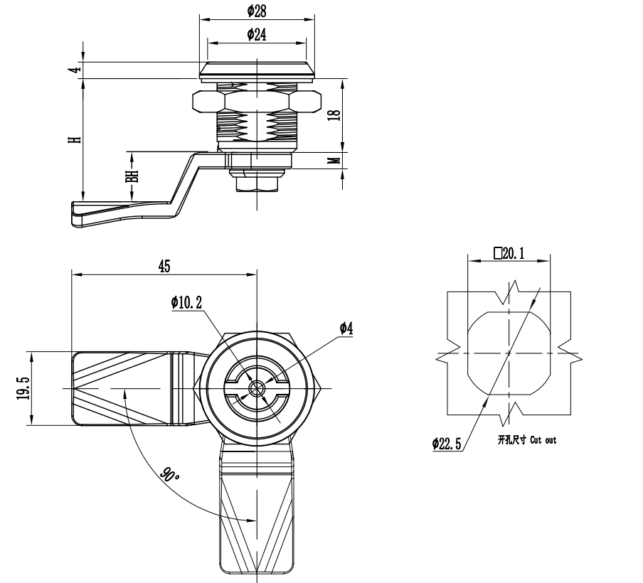 Quarter turn lock Double bit 4mm,IP65 Stainless steel,D1-1401-014
