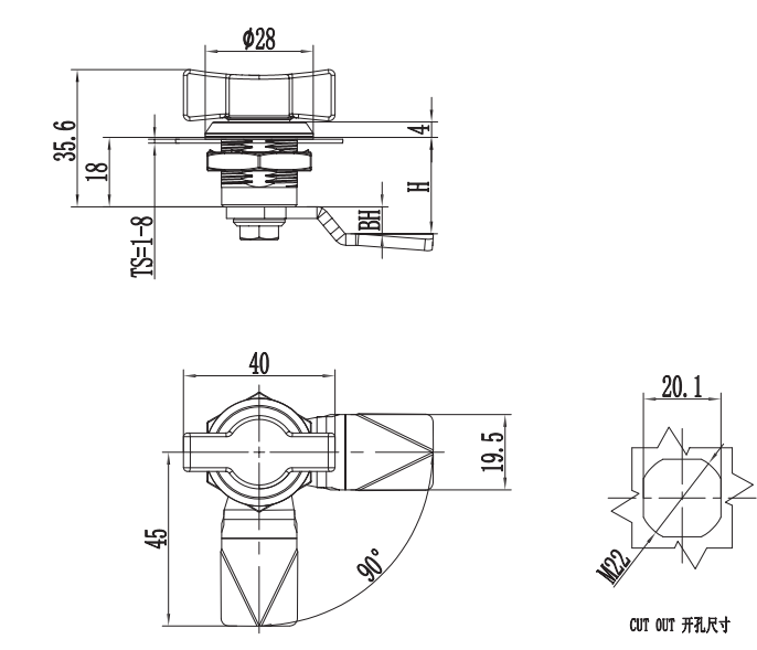 Rotate the handle 90° to open or lock