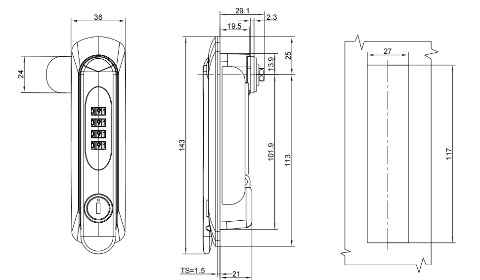 Swing handle lock, 4-digit combination code, left and right universal, rotary handle open, Zinc alloy, chrome plating, bright,MS819-20