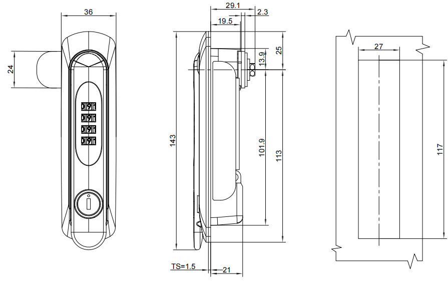 Swing handle lock, 4-digit combination code, left and right universal, rotary handle open, zinc alloy, chrome plating, silver,MS819-30