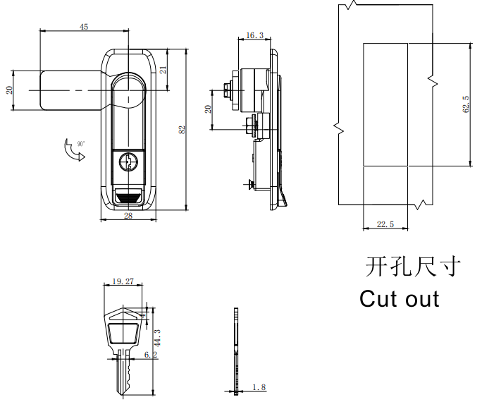Swing handle lock, K200 key lock,left and right, swivel handle open, zinc alloy, spray paint, silver,MS738-30