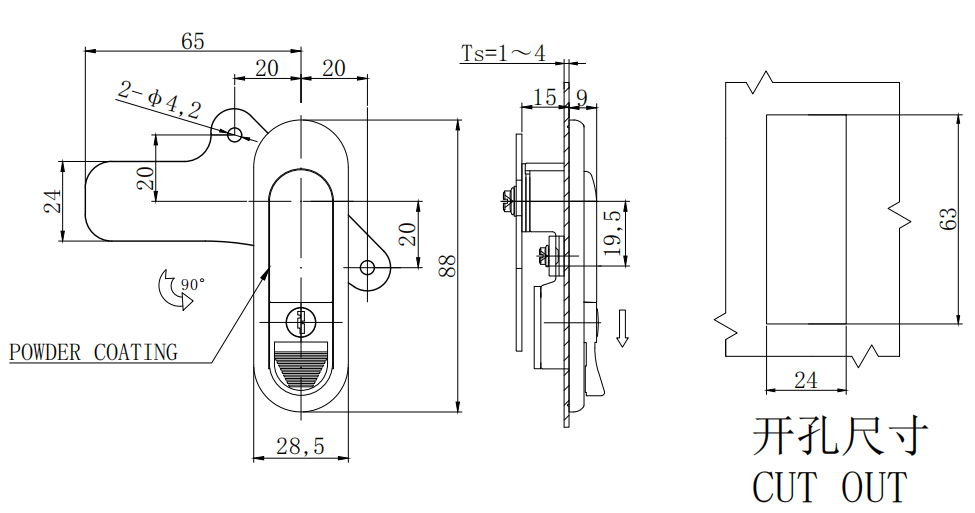 Swingl handle lock, K200 key lock, left and right universal, swivel handle open, zinc alloy, powder coated, black,AB303-10