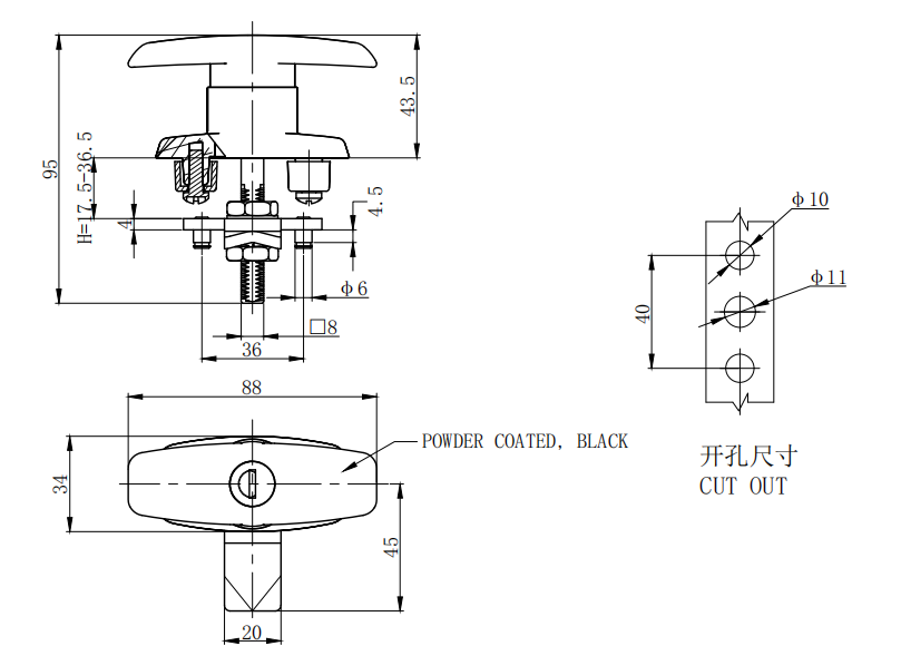 T-handle, three-point mounting, zinc alloy, powder coated, black,B-1512